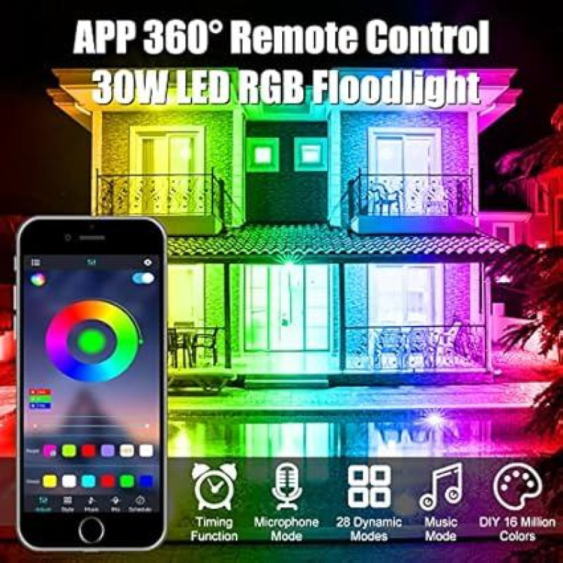 30 W LED spotlight RGB and DIY colour setup: 30 W LED RGB spotlight consists of 48 LED lamp beads. RGB LED headlight can adjust brightness and speed (10%-100%). This LED floodlight RGB has 160,000 colours and 28 dynamic modes, 3 DIY colours from a variety of colours adjustable by increasing or reducing the ratio of red, green and blue. \