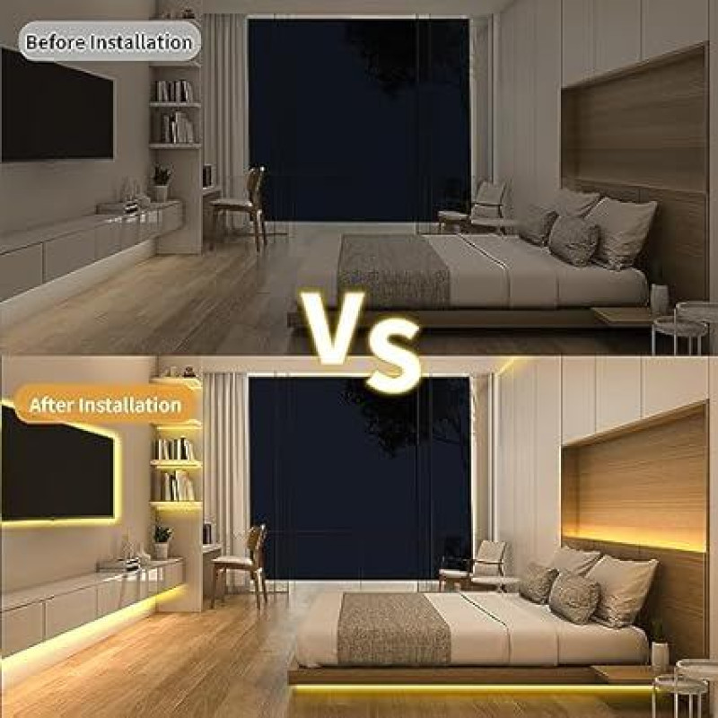 Bright and uniform: COB LED strip is an updated LED strip, compared to SMD LED strip, COB no dark spot, even and brighter, even when used with aluminium housing. Airand COB LED strip with (480LEDs/M) high-density design, higher light efficiency, higher colour rendering index (CRI90+), lower power consumption. 3000 K warm white LED strip has a very soft and even lighting, gives you a beautiful warm and natural atmosphere Dimmable and dynamic and timer: LED strip 10 m with 16-button RF remote control, 10%-100% brightness selection, 8 dynamic modes to choose from. 1H-8H timer function and timer cancel function added. You can choose different brightness and modes depending on the scene. LED strip light 10 m warm white has a memory function that maintains the light effect of the last power failure Flexible and self-adhesive and cutting: the self-adhesive LED strip can be bent at any angle. Light strip with 3M adhesive backing LED light strips can be safely mounted on dry, smooth surfaces. Light strip 10m comes with 2 plugs and 1 6.1 inch connection cable in the package, you can connect directly or freely splicing 360°. You can design the light length and shape of the self-adhesive LED strip light as needed Safety and waterproof and long service life: COB LED strip working voltage is 24 V low voltage, compared to ordinary light strips, LED strips better heat dissipation, the LED strip is also IP44 waterproof, so there is no need to worry about damage caused by moisture. Lightstrip has no harmful substances, high quality certified light strip. The average service life of these LED strips is up to 50,000 hours Wide range of applications: LED strip 10 m warm white 3000 K is perfect for indoor lighting decoration, the dimmable brightness function of the light strip is suitable for different scenes. Such as living room, bedroom, kitchen, hallway, wardrobe, cabinet, cosmetic mirror, TV, staircase, bookcase, work desk lamp, bar, restaurant, party, bathroom and bed lighting backlight, etc. LED strip gives you a beautiful warm and natural atmosphere › See more product details