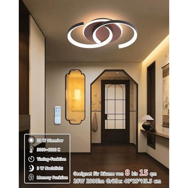 S-type ceiling light wood: made of aluminium, walnut and silicone strips, black 2-ring frame, hard texture, robust and durable. The wood is covered with a protective varnish, which is not only beautiful, but also corrosion resistant and insect proof, which is the best choice for your interior lighting. such as living room, bedroom, children's room, dining room, kitchen, hallway, study, hotels, etc Parameters of the ceiling light black: modern ceiling light size 40 x 25 x H 5.5 cm; with remote control adjustable brightness 10%-100%, adjustable colour temperature 3000-6000 K; voltage AC220-240 V; light output 28 W 2800 lm; with memory function, 3 W night light function; suitable for rooms of 8-15 m² Bedroom lamp dimmable brightness and colour temperature: with the remote control, the brightness of the 28 W LED ceiling light can be adjusted from 10%-100% and the colour temperature from warm white, neutral white to cold white (3000 K to 6000 K); power only 3 W in night light mode. A soft and quiet light source can help you relax your mood and improve sleep quality (not compatible with dimmer) 3 functions of your wall switch: 1. Turn on/off. Continuous switching within 3 s to change the colour temperature (3000 K, 4000 K, 6000 K, 4000 K 10% brightness night light). Turn on for more than 30 s and off for more than 15 s to activate the memory function (the remote control always keeps the settings always the settings from the last turn off) Beautiful and energy-efficient bedroom lamp: the 28 W ceiling light uses high-quality SMD2835 lamp beads, no glare, no radio frequency interference, no flash and uniform luminescence. The 250 W incandescent bulbs can replace energy by more than 90% and do not need to replace bulbs; the average service life is more than 30,000 hours › See more product details