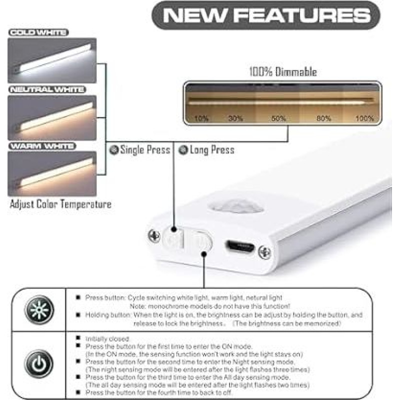 4 modes of use: Enjoy maximum comfort with its four operating modes: always on, active sensor all day, night sensor and off with adjustable brightness. Perfect to adapt to your lighting needs at any time. (Brightness adjustable in all modes) USB rechargeable: thanks to the rechargeable battery, you can enjoy efficient and economical lighting with quick and easy charging via the USB port. 【Easy Installation】 On metallic and non-metallic surfaces: thanks to the integrated magnetic rod, it can be easily attached to metal surfaces such as shelves or door frames. In addition, it contains adhesives for quick and safe installation on non-metallic substrates without the need for tools. Environmentally friendly: Our product certified according to international standards not only provides exceptional performance, but also reduces the carbon footprint. With high-quality materials and energy efficiency, we contribute to a sustainable and long-lasting future. Protect the environment with us and enjoy responsible and efficient products. 【Guaranteed customer service】If you have any questions or problems with your order, our customer service team is at your disposal to solve them as soon as possible and ensure customer satisfaction. › See more product details; Product description 30cm LED Cabinet Light - 500mAh Battery The 30cm LED cabinet light is perfect for medium sized areas such as large closets or hallways. With a 500mAh battery, it ensures long-lasting and efficient lighting, perfect for all lighting needs of your home. Key Features: Intelligent lighting modes: First mode: Always on. Second mode: sensor active all day long. Third mode: sensor only active at night. Fourth Mode: Off(Brightness can be adjusted in all modes) Precise motion sensor: detects movement up to 2-3 meters and automatically turns off when no activity is detected. Magnets on the back: thanks to the magnets on the back, installation is quick and easy, allowing the light to be attached to any metal surface. 500mAh Battery: USB charging ensures fast charging and provides hours of continuous lighting. Modern and functional design: With a length of 30 cm, this light is ideal for medium-sized areas and provides efficient and clear lighting. GUARANTEED VERSATILITY This LED light is perfect for lighting cabinets, hallways, furniture interiors and more and is an ideal option for any corner that needs extra light.; Product description 30cm LED Cabinet Light - 500mAh Battery The 30cm LED cabinet light is perfect for medium sized areas such as large closets or hallways. With a 500mAh battery, it ensures long-lasting and efficient lighting, perfect for all lighting needs of your home. Key Features: Intelligent lighting modes: First mode: Always on. Second mode: sensor active all day long. Third mode: sensor only active at night. Fourth Mode: Off(Brightness can be adjusted in all modes) Precise motion sensor: detects movement up to 2-3 meters and automatically turns off when no activity is detected. Magnets on the back: thanks to the magnets on the back, installation is quick and easy, allowing the light to be attached to any metal surface. 500mAh Battery: USB charging ensures fast charging and provides hours of continuous lighting. Modern and functional design: With a length of 30 cm, this light is ideal for medium-sized areas and provides efficient and clear lighting. GUARANTEED VERSATILITY This LED light is perfect for lighting cabinets, hallways, furniture interiors and more and is an ideal option for any corner that needs extra light.; 30cm LED Cabinet Light - 500mAh Battery The 30cm LED cabinet light is perfect for medium sized areas such as large closets or hallways. With a 500mAh battery, it ensures long-lasting and efficient lighting, perfect for all lighting needs of your home. Key Features: Intelligent lighting modes: First mode: Always on. Second mode: sensor active all day long. Third mode: sensor only active at night. Fourth Mode: Off(Brightness can be adjusted in all modes) Precise motion sensor: detects movement up to 2-3 meters and automatically turns off when no activity is detected. Magnets on the back: thanks to the magnets on the back, installation is quick and easy, allowing the light to be attached to any metal surface. 500mAh Battery: USB charging ensures fast charging and provides hours of continuous lighting. Modern and functional design: With a length of 30 cm, this light is ideal for medium-sized areas and provides efficient and clear lighting. GUARANTEED VERSATILITY This LED light is perfect for lighting cabinets, hallways, furniture interiors and more and is an ideal option for any corner that needs extra light.