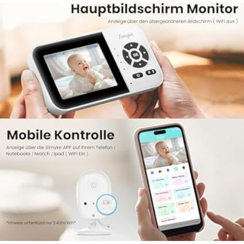 100% privacy: WiFi ON/OFF, easy to set up and the brightness of night vision: Adopted advanced 2.4GHz FHSS and digital encryption technology, 100% privacy and protection from hackers. Range of up to 300 m (outdoor test). You can rest assured that only you can hear and see your baby. Always stay connected with your baby: Simyke baby room camera with two-way conversation function, microphone volume can be adjusted as needed. Convenient for you to talk to your baby at any time. With the soothing voice of the mother, the baby will not be scared. Scream detection: Simyke WiFi baby monitor can detect your baby's cry and notify you of pop-ups of the mobile app. When you use the parent screen with VOX mode on, the screen lights up to warn you when the baby camera detects your baby's cry. ❤ Increased battery capacity: The no-WiFi baby monitor is equipped with a high capacity 2500 mAh battery. The display can be used for 10 hours with the screen constantly on, and you can use it for 14 hours in VOX power saving mode. ❤Family Sharing & Storage: Simyke WiFi supports adding family members, you can set permissions to use your relatives' accounts, even relatives in other countries can see babies. Baby camera supports cloud storage and SD card storage (up to 128G). › See more product details; Product description Warm Tips Simyke baby monitor only supports 2.4GHz Wi-Fi, does not support 5G Wi-Fi. If your house does not have WiFi 2.4 GHz, please buy with care. What is included? 2 x baby camera, 1 x baby monitor, 1 set of power adapters, 1 set of power adapters, 1 set of power adapters, 1 x user manual (English language not guaranteed); Product description Warm Tips Simyke baby monitor only supports 2.4GHz Wi-Fi, does not support 5G Wi-Fi. If your house does not have WiFi 2.4 GHz, please buy with care. What is included? 2 x baby camera, 1 x baby monitor, 1 set of power adapters, 1 set of power adapters, 1 set of power adapters, 1 x user manual (English language not guaranteed); Warm Tips Simyke baby monitor only supports 2.4GHz Wi-Fi, does not support 5G Wi-Fi. If your house does not have WiFi 2.4 GHz, please buy with care. What is included? 2 x baby camera, 1 x baby monitor, 1 set of power adapters, 1 set of power adapters, 1 set of power adapters, 1 x user manual (English language not guaranteed)