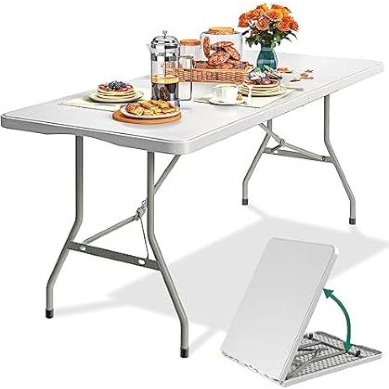 Large table top: the large table top of 180 x 75 cm offers enough space for 6-8 people to comfortably eat together and keep food, desserts and drinks safe Stable and durable: a sturdy metal frame, fixed legs and a table top made of HDPP ensure great strength, stability and a load capacity of up to 150 kg. The waterproof graphic layer on the table legs prevents rusting and thus increases longevity EASY TO CARRY & INSTALL Our folding table features a side handle to carry it comfortably when folding. It weighs only 12 kg and is easy to carry. Easy assembly and disassembly without tools is done using the enclosed step-by-step instructions (English language not guaranteed) Convenient storage and cleaning: when folded, the table measures only 90 x 75 x 8 cm and can be easily stored without taking up much space. The smooth surface wipes clean easily when it rains or a drink is spilled Suitable for indoor and outdoor use: our camping table is ideal for a variety of leisure activities such as camping, caravanning, picnics, parties, fishing, studying, barbecues, etc. It can also be used by dealers at market stalls, trade fairs and exhibitions › See more product details