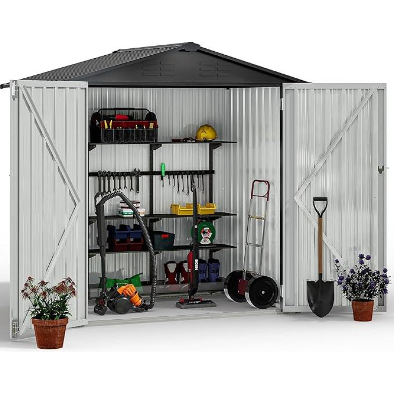 Distinctive Highlights:150cm higher hinged door makes it easy to get in and out, coupled with a lockable design to protect your belongings outside; Two built-in vents are built to ensure excellent air circulation. ALL WEATHER PRACTICALITY Thickened galvanized steel and sturdy frame harmonize and provide great rust protection to this outdoor shed. Overlapping wall panels work with sloped roof to prevent rainwater from collecting or penetrating for year round use. MULTI-FUNCTIONAL A versatile outdoor shed available for multipurpose use, such as a convenient garden storage room, warm pet shelter, or a tidy garbage collection chamber; Perfect for backyard, garden, patio, etc. SPACIOUS ORGANIZER With external dimensions of 75\