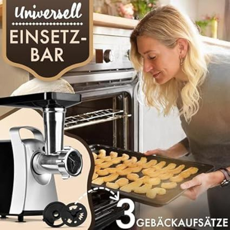 Forward and reverse function - no more tedious turning back! The forward and reverse function makes working with our meat grinder easy and stress-free Lightning-fast processing of large quantities - pamper your guests with homemade delicacies in record time - the meat grinder creates large quantities in no time at all Versatile preparation - chop (tartar) of meat and fish, kebbe or sausage! With this all-rounder, all possibilities are open to conjure up your favourite recipes Rotating filling tray - Maximum convenience when filling - The rotating filling tray makes adding ingredients a breeze without interruptions The metal neck, the metal auger and the 4-blade stainless steel knife guarantee durability and quality, so you can enjoy your meat grinder for years › See more product details