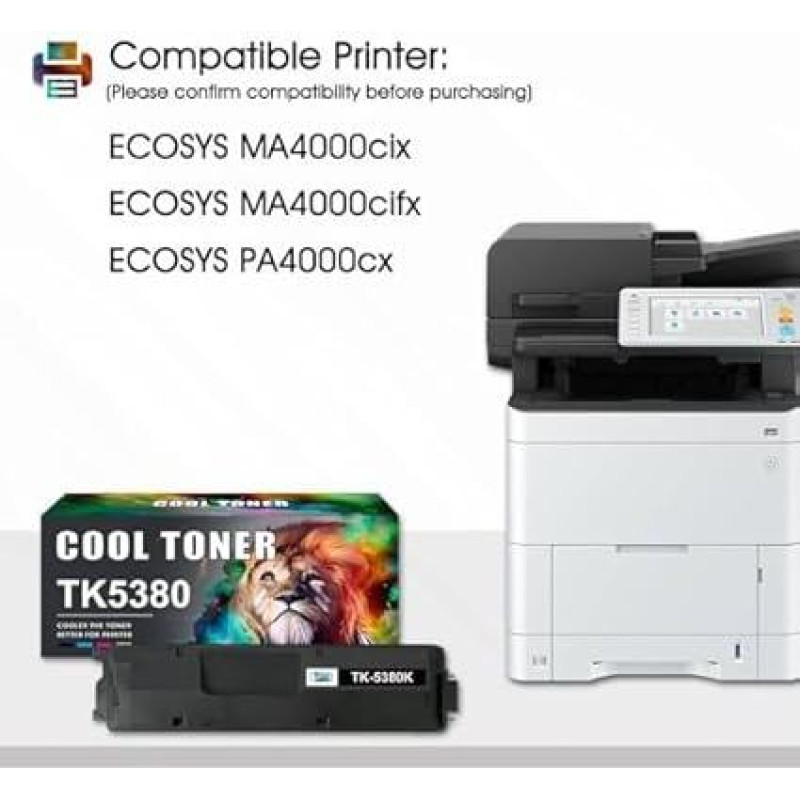 Package contents: compatible with TK5380 TK 5380 TK-5380K TK-5380M TK-5380Y TK-5380C TK5380K TK5380M TK5380Y TK5380C toner (with chip, not original) Capacity of the toner cartridge: approx. 13,000 pages TK 5380K (black), approx. 10,000 pages (colour) per TK 5380C 5380 5380Y colour toner cartridge (letter/A4, at 5% coverage) Compatible with: ECOSYS MA4000cix MA4000cifx PA4000cx Toner colour: 1 black TK-5380K TK5380K, 1 cyan TK-5380C TK5380C, 1 yellow TK-5380Y TK5380Y, 1 magenta TK-5380M TK5380M toner cartridges with instructions Package contents: 4 compatible colour ink cartridges › See more product details