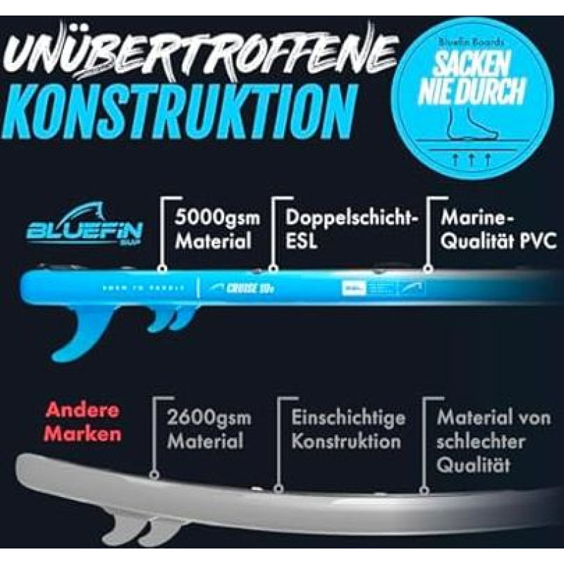 10.8 – Are you looking for the most robust, versatile, all inclusive SUP package? Only Bluefin uses 1000 Denier Exo Surface Laminating PVC & Pro Weave Drop Stitch. These materials make our boards so robust that they can withstand up to 28 PSI and are the strongest, safest, stand up paddle boards you'll ever buy. Cruise 10'8 is ideal for 1 Pers + dog or sitting passengers: 325 cm x 83.5 cm x 16 cm. Durable SUP travel rucksack and lightweight fibreglass paddle – the most comfortable SUP rucksack for your stand up paddle board (inflatable) with lots of additional padding and extra wide shoulder straps. The adjustable 2-piece paddle has an ergonomic fibreglass shaft that weighs almost 45% less than conventional stand up paddles. The sturdy polyurethane shovel blade cannot break or be damaged. Both float on water and will not go under! Kayak conversion kit and GoPro holder – convert your stand up paddle board (inflatable) into a SUP-kayak in seconds with our D-rings! Attach our comfortable padded seat and interchangeable SUP handle with the Kayak paddle extension. Integrated GoPro mount at the top of the board to record your experiences with ease. Smart Lock Fin & Double Action Air Pump – Our versatile 8-inch centre fin with optimised design offers ultimate glide comfort and versatility when paddling. No metal parts that can be lost. Secure build in seconds. The double action air pump inflates and deflates the inflatable stand-up paddle board. › See more product details