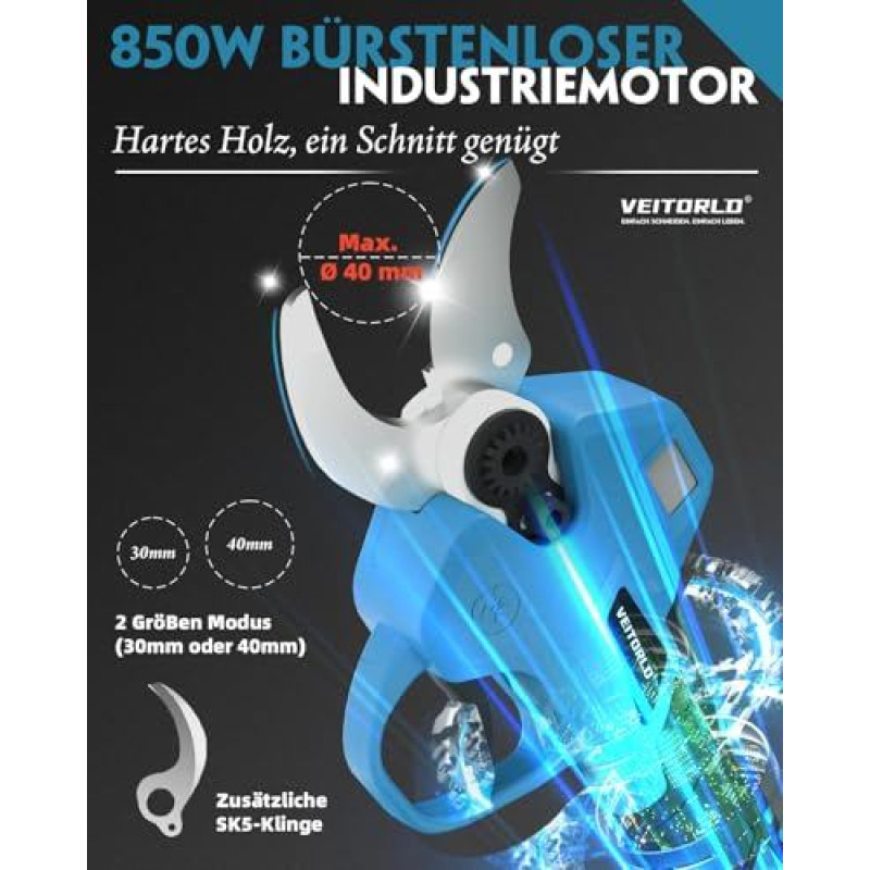 Removable telescopic rod: the electric scissors can be used alone or with the removable telescopic rod (130-245 cm) - no more ladders, for more safety and efficiency! DynaTorque brushless motor: TÜV-certified industrial motor with 30% more torque - even 40 mm hard branches precisely cut with just one push of a button Ergergotec Pro DIN+: unlike Asian models with DIN 33402 compliant grip contours for 9-11 cm European hand circumference: 6 hours continuous operation at 85% muscle strength retention thanks to 3-zone damping angle DualCut 40/30 mm cutting mode: 2-second trigger hold for switching between 40 mm and 30 mm CutTrack work counter: integrated counting mechanism logs each cut count SleepStart Pro: 60-second auto sleep, 4-second long press to shut off, multiple start (physical battery start button & double trigger) New German support team: we stand next to you: 24/7 for your perfect gardening experience + step-by-step video instructions with every purchase › See more product details