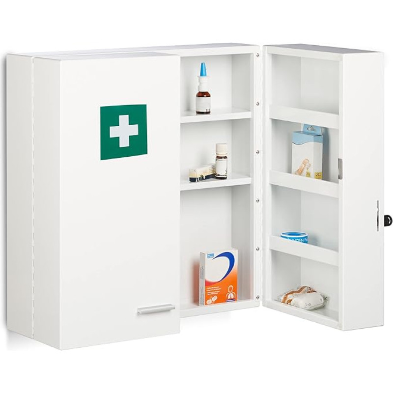 Home medicine cabinet: Large medicine cabinet with 11 compartments for medicines, dressing materials and much more. With key: lockable medicine cabinet for child-safe storage - includes spare key Double door: doctor's cabinet with 2 doors with magnetic closure and piano hinge for 180° opening angle Basics: XXL medicine cabinet made of robust steel for wall mounting - dimensions (H x W x D): approx. 53 x 53 x 21.5 cm All-rounder: classic apothecary cabinet in white with green cross - for bathroom, doctor's practice or school › See more product details