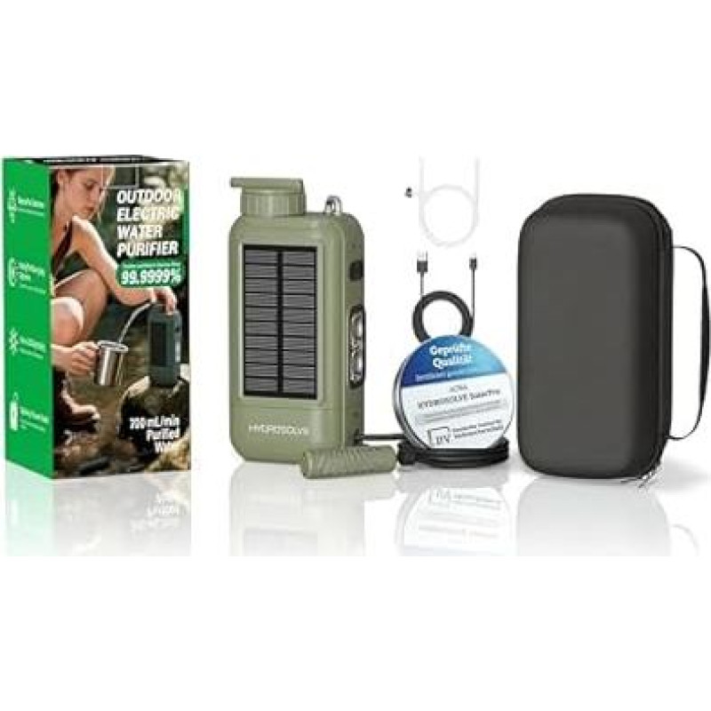 HYDROSOLVE SolarPro lauko vandens filtras | Elektrinis, nešiojamas ir įkraunamas | 0,01 mikronų | Saulės/USB/Mains | Power Bank 5000 mAh | Stovyklavimui, žygiams, ekstremalioms situacijoms ir išgyvenimui (HYDROSOLVE SolarPro)