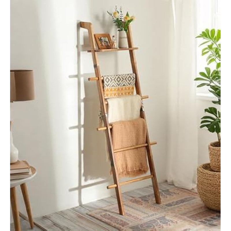 ZUNTO 5 pakopų medinės rankšluosčių kopėčios su lentyna ir kabliukais - vintažinės rankšluosčių kopėčios su lentyna vonios kambariui, svetainei ir miegamajam - dekoratyvinės kopėčios rankšluosčiams, antklodėms ir dekoracijoms, rudos spalvos