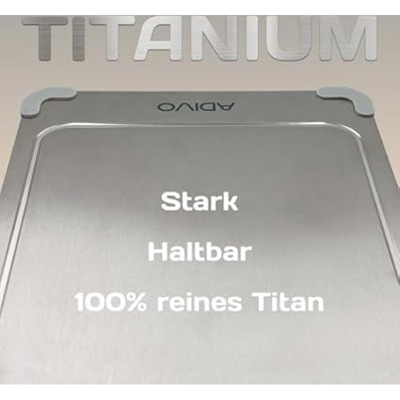adivo 100 % gryno titano pjaustymo lenta, galima naudoti iš abiejų pusių, itin plona ir lengva, antibakterinė, lengvai valoma, atspari rūdims, 39 x 28 x 0,15 cm, silikoniniai kampai, idealiai tinka stovyklavimui ir lauko darbams
