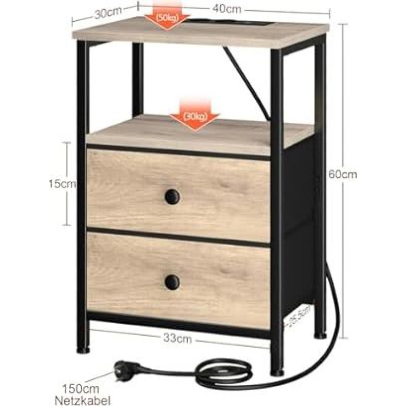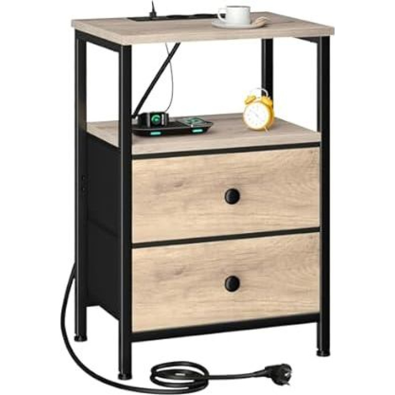AMHANCIBLE Naktinis staliukas su įkrovimo funkcija, šoninis staliukas su medžiaginiais stalčiais, sofos staliukas su atvira lentyna, su 2 USB prievadais ir 2 lizdais, miegamojo naktinė spintelė, svetainė, pilka HETS020GY-1
