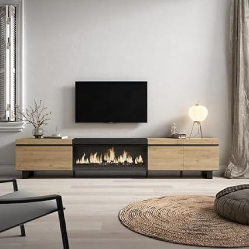 "Skraut Home" televizoriaus spintelė, maža lentynėlė svetainei ir valgomajam, 288 x 57 x 35 cm, skirta didelio formato televizoriui, elektriniam židiniui, XXL, pramoninio dizaino, modernaus stiliaus, ąžuolo juodos spalvos