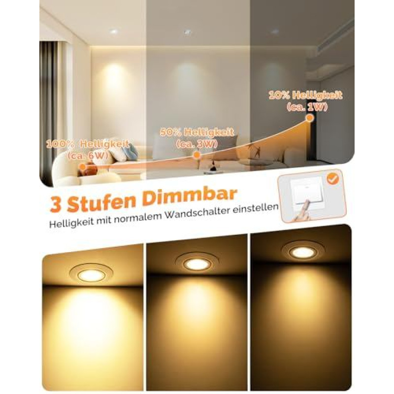 wowatt 6 LED prožektoriai, 3 lygiai, reguliuojamas apšvietimas, 6 W LED įleidžiami prožektoriai, 230 V, pasukami, 3000 K, šilta balta, 4000 K, neutrali balta, 6000 K šalta balta, lubų prožektoriai, balti, 68 mm skylės dydis, IP44 įleidžiami šviestuvai, pl