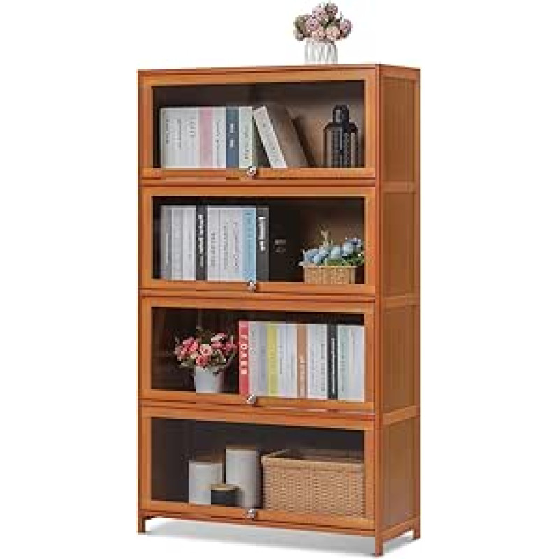 "Magshion Bamboo Display Cabinet Bookcase 4 Tier Clear Acrylic Folding Doors Wide Brown Kitchen Cabinet Storage Pantry Display Cabinet Storage Cabinet Organizer - 31 "L x 12.5"