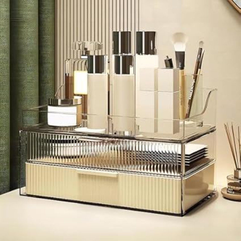 DASITON Makiažo organizatorius su stalčiais, dulkėms atspari dviejų sluoksnių kosmetikos laikymo priemonė, didelis kosmetikos organizatorius, odos priežiūros organizatorius, kosmetikos organizatorius miegamajam, vonios kambariui, kreminis 01