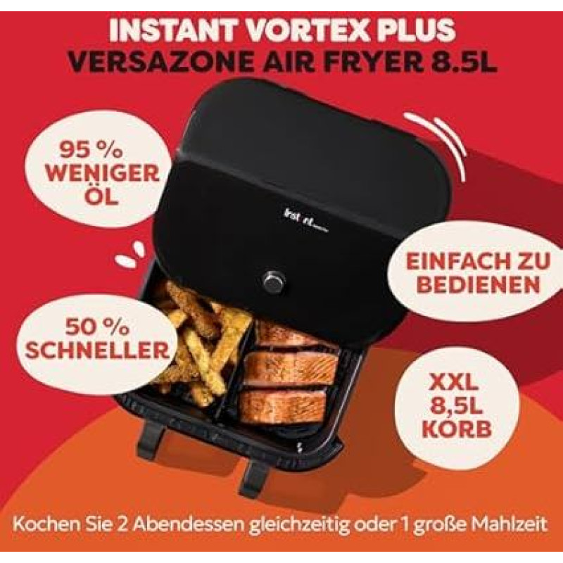 "Instant Pot" - "Versazone Dual Black" karšto oro keptuvė - didelė 8,5 l šeimos dydžio - vienas dvigubas krepšys su pertvara - 8 viename - dehidratacija, kepimas ant grotelių, kepimas, skrudinimas, pašildymas, nesvylanti danga