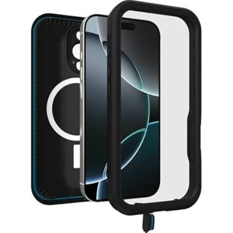 "OtterBox" iPhone 16 Pro FRFRE serijos vandeniui atsparus dėklas su "MagSafe" (sukurtas "LifeProof") - juodas, atsparus vandeniui, 60 % perdirbto plastiko, plonas ir stilingas
