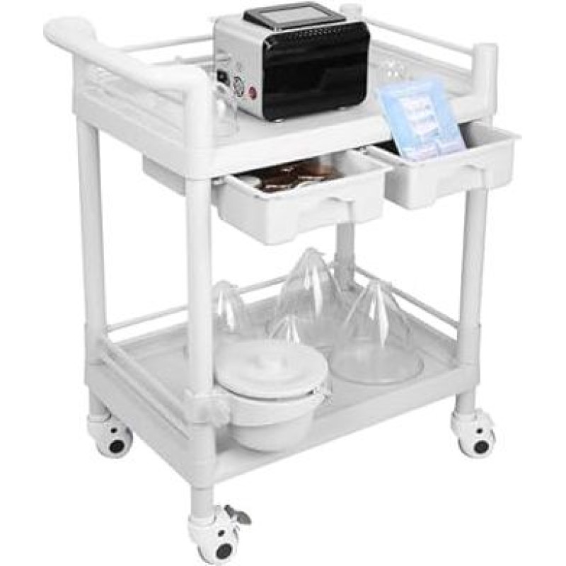 Grožio vežimėlis su ratukais, kosmetikos vežimėlis su turėklais, kibirėliu ir 2 dideliais stalčiais, 2 aukštų sunkiųjų dulkių terapijos aparatų vežimėlis, 150 kg apkrova, 360° besisukantys tylūs ratukai