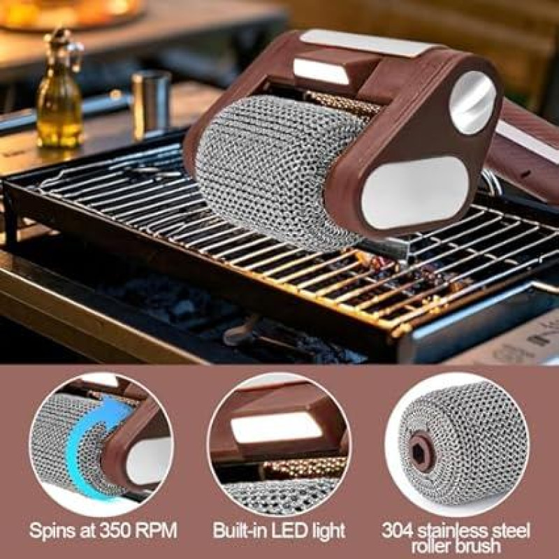 Elektrinis grilio valytuvas, 304 nerūdijančio plieno grilio valytuvas, besisukantis grilio šepetys be šerių su LED, belaidis ir įkraunamas, 350 aps./min, grilio valymo šepetys lauko griliui