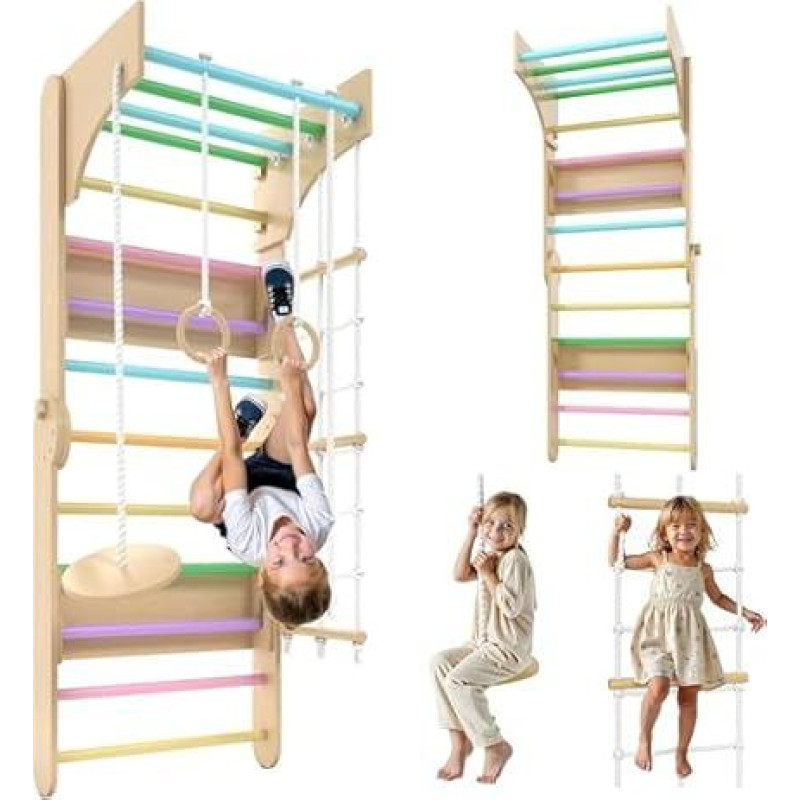 Sienelės vaikų kambariui "6-in-1" - vidaus medinis laipiojimo rėmas su laipiojimo sienele, sūpynėmis ir žiedais motoriniams įgūdžiams lavinti namuose