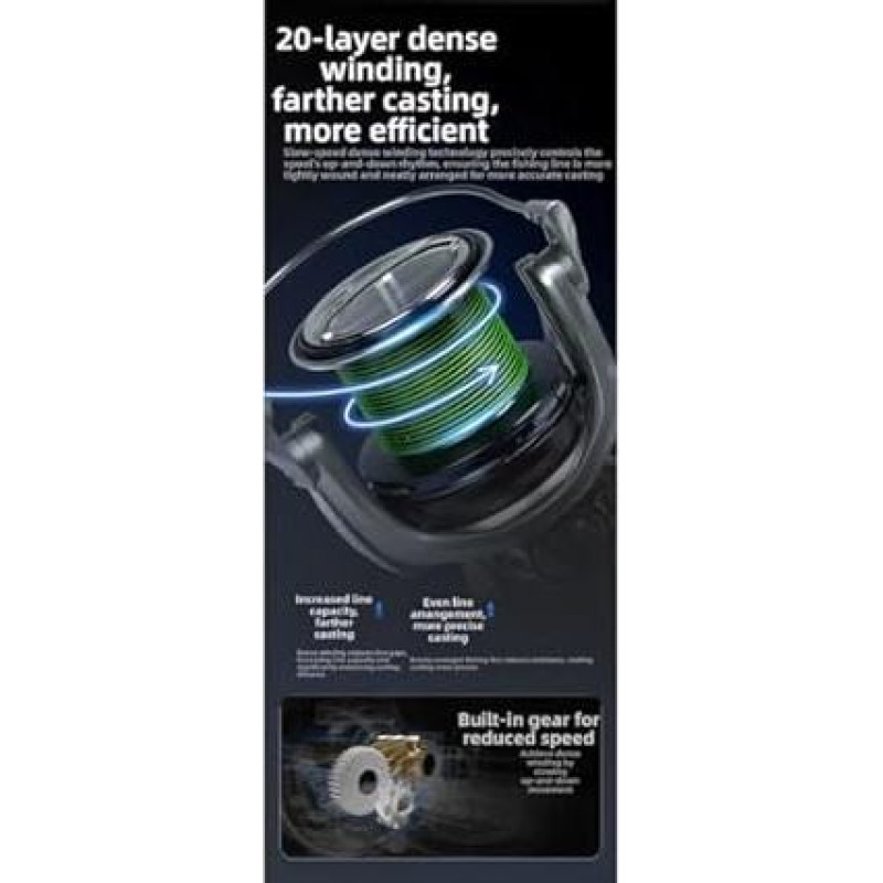 Žvejybos ritė su tvirtu metaliniu korpusu, dvigubai sandariais rutuliniais guoliais 8+1 ir 20 kg stabdžiu, skirta kontroliuojamai lėtai nusileidžiančiai žvejybai