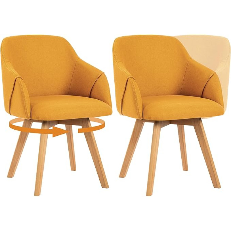 Ergonomic design for maximum comfort: this ergonomic chair offers optimal comfort with its back-friendly shape and practical armrests. The 360° swivel function allows for effortless movement - ideal for use as a dining chair or kitchen chair. This function supports flexible use at the dining table and ensures a high level of seating comfort during long sessions. High-quality linen cover and padded seat: With a breathable linen cover and soft, high-quality padding, this chair is ideal for longer periods of sitting. The seat offers perfect support thanks to the elastic padding and ensures comfortable sitting hours. The dining chair is suitable for both the dining room and the living room or as a dressing table chair. Sturdy wooden legs for a high load capacity: the wooden legs made of beech wood provide a stable base and a maximum load capacity of up to 136 kg. With the robust legs, this swivel chair is particularly durable and resistant to wobbling. The classic wood design makes it a stylish dining chair 360° rotating function with armrests for flexibility: the 360° rotation function provides high flexibility, perfect for dining chairs suitable for both dining and work environments. Armrests increase comfort and support a relaxed sitting posture. Ideal as a kitchen chair, dining chair or for desks. Easy to assemble and versatile: With a quick and easy assembly, this chair is a practical piece of furniture for any home. Ideal as a dining chair in a set of 4, for kitchen chairs, or as a stylish dressing table chair. The chair can be assembled in no time at all and fits perfectly into any modern dining room or living room. › See more product details; Product description Swivel Dining Room Chairs Set of 2 with Wooden Legs, 360° Upholstered Chair with Armrest, Fabric Cover, Wooden Legs, Mid-Century Design, Comfortable Kitchen Chair for Dining Room and Living Room; Product description Swivel Dining Room Chairs Set of 2 with Wooden Legs, 360° Upholstered Chair with Armrest, Fabric Cover, Wooden Legs, Mid-Century Design, Comfortable Kitchen Chair for Dining Room and Living Room; Swivel Dining Room Chairs Set of 2 with Wooden Legs, 360° Upholstered Chair with Armrest, Fabric Cover, Wooden Legs, Mid-Century Design, Comfortable Kitchen Chair for Dining Room and Living Room