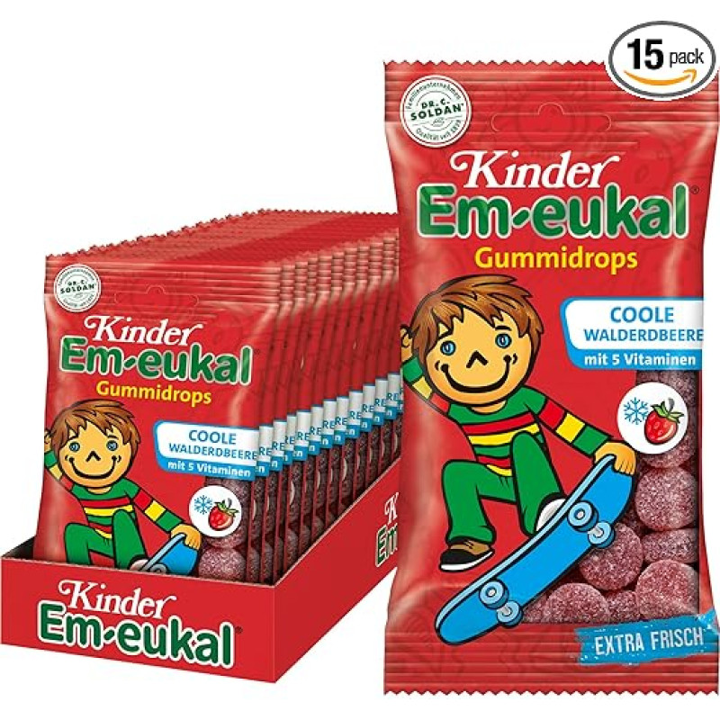 "Kinder Em-eukal" guminukai "Cool Wild Strawberry", su 5 vitaminais, laukinių braškių medus, 15 vnt. (15 x 75 g pakuotė)