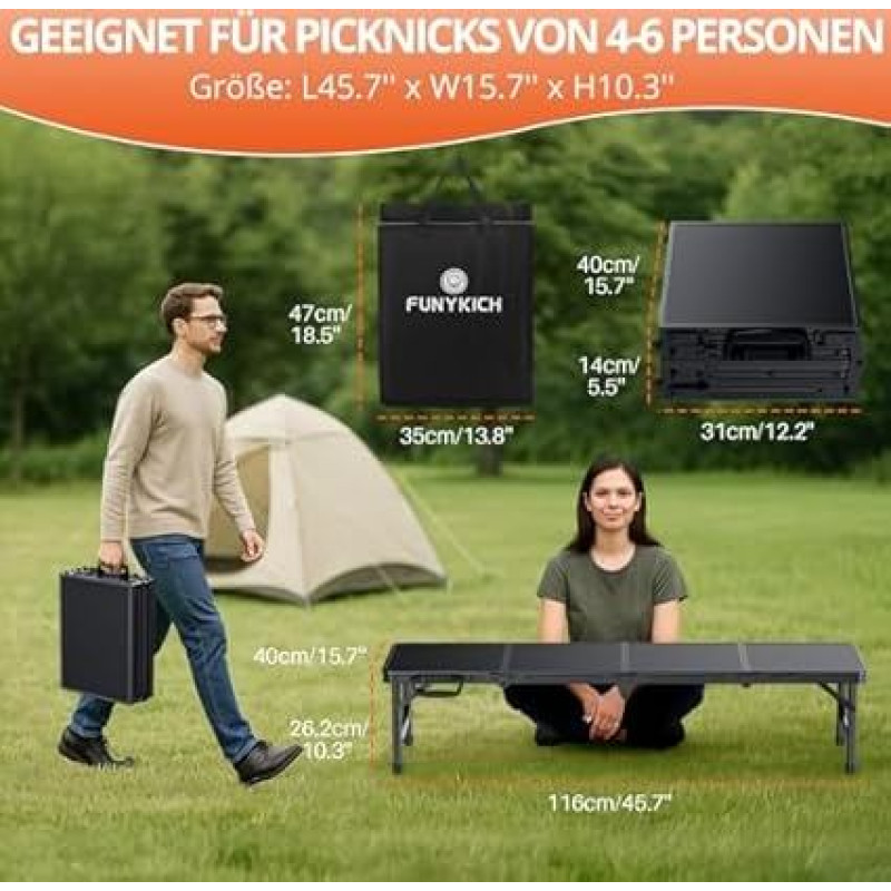 FUNYKICH 4 pėdų sulankstomas stovyklavimo stalas, 116 x 40 x 26 cm, mažas sulankstomas stalas su dovanomis, aliuminio nešiojamasis sulankstomas stalas, MDF plokštės, daugiafunkcinis stalas piknikui, stovyklavimui, paplūdimiui, balkonui