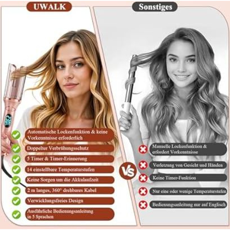 Automatinė garbanojimo geležis Automatinė plaukų garbanojimo žnyplė: Elektrinis plaukų garbanojimo prietaisas su 14 temperatūros lygių 100-230 °C ir 5 laikmačiais - 25 mm ilgų plaukų garbanojimo strypas su LED ekranu ir apsauga nuo nudegimo