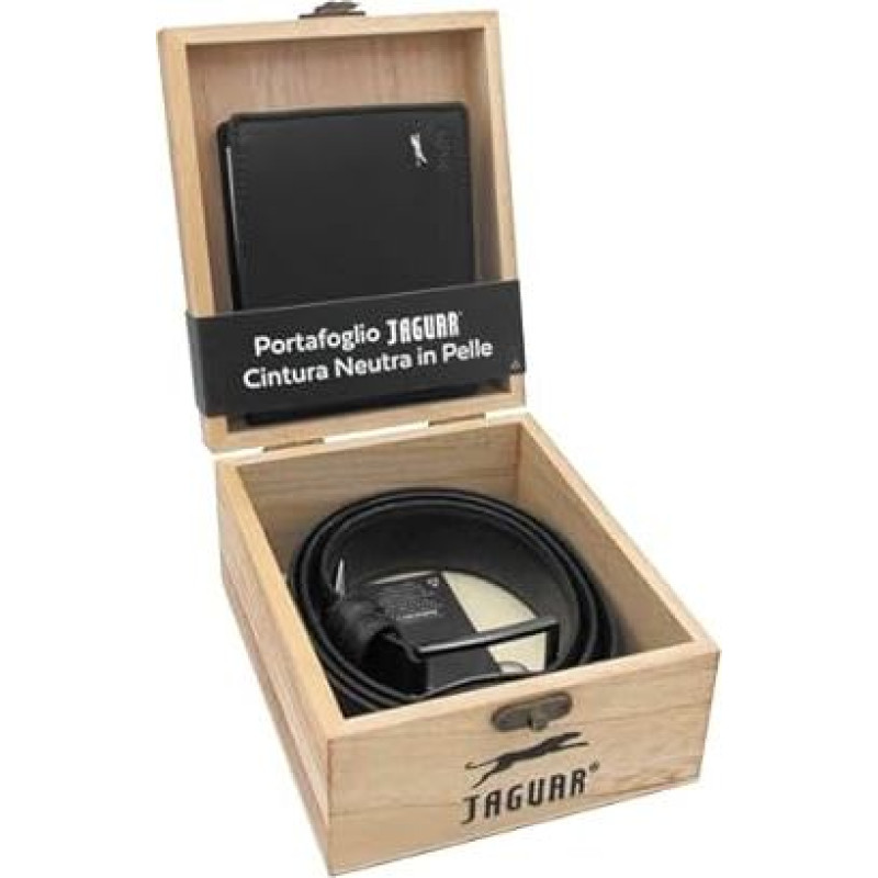 JAGUAR dovanų rinkinys Odinė piniginė su RFID ir diržu 125 cm medinėje dėžutėje