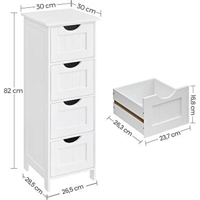 VASAGLE LHC40W Vonios spintelė Šoninė spintelė su 4 stalčiais 30 x 30 x 82 cm, skirta vonios kambariui Svetainė Valgomasis Virtuvė Šiuolaikinė balta