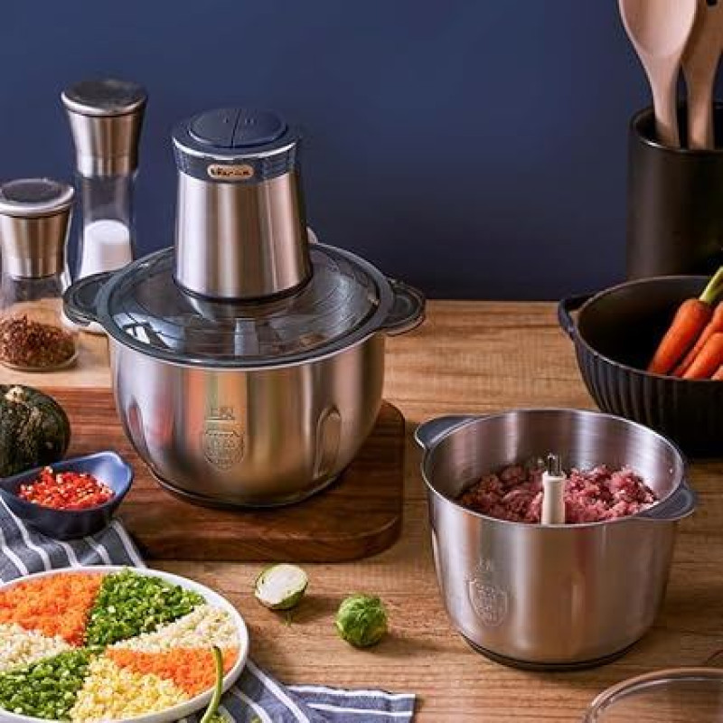 Bear 2 l + 1,8 l elektrinis mini smulkintuvas 600 W 2 greičių lygių smulkintuvas su 4 nerūdijančio plieno ašmenimis ir mėsmale, stiklinis smulkintuvas mėsai, kūdikių maistui, vaisiams, daržovėms