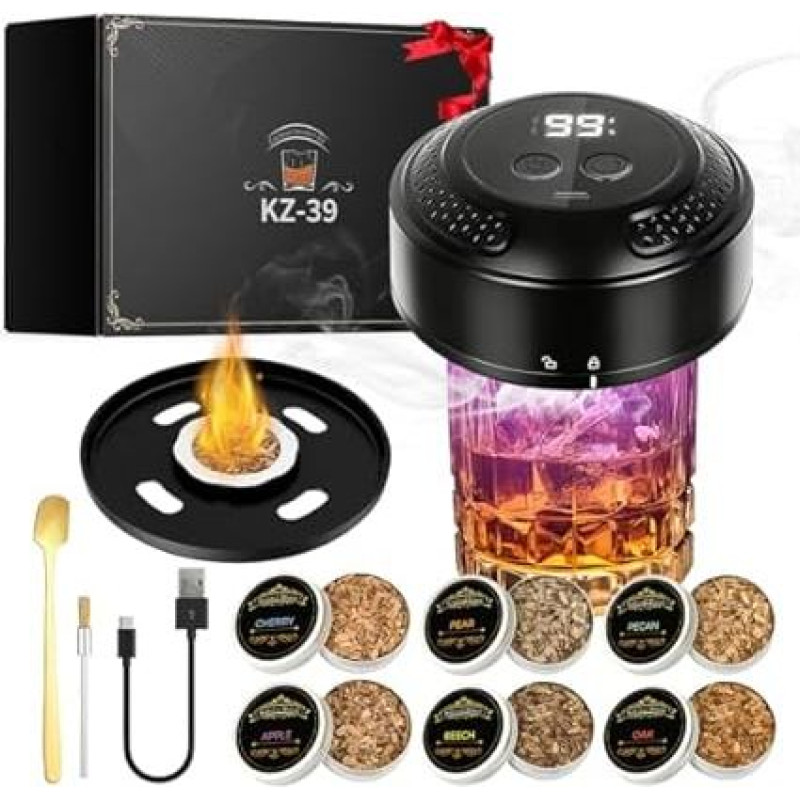 Viskio rūkyklės rinkinys, viskio dūmų elektrinė rūkykla, kokteilių rūkykla su 6 aromatingomis rūkymo medžio drožlėmis Burbono gėrimo infuzorius Viskio dovana vyrams Jubiliejinis gimtadienis Kalėdos