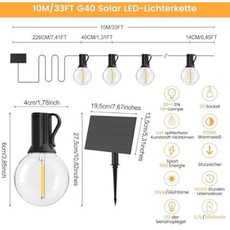 Saulės pasakų žibintai lauko nuotolinio valdymo 10 m G40 sodo pasakų žibintai su 20 LED plastikinių lempučių