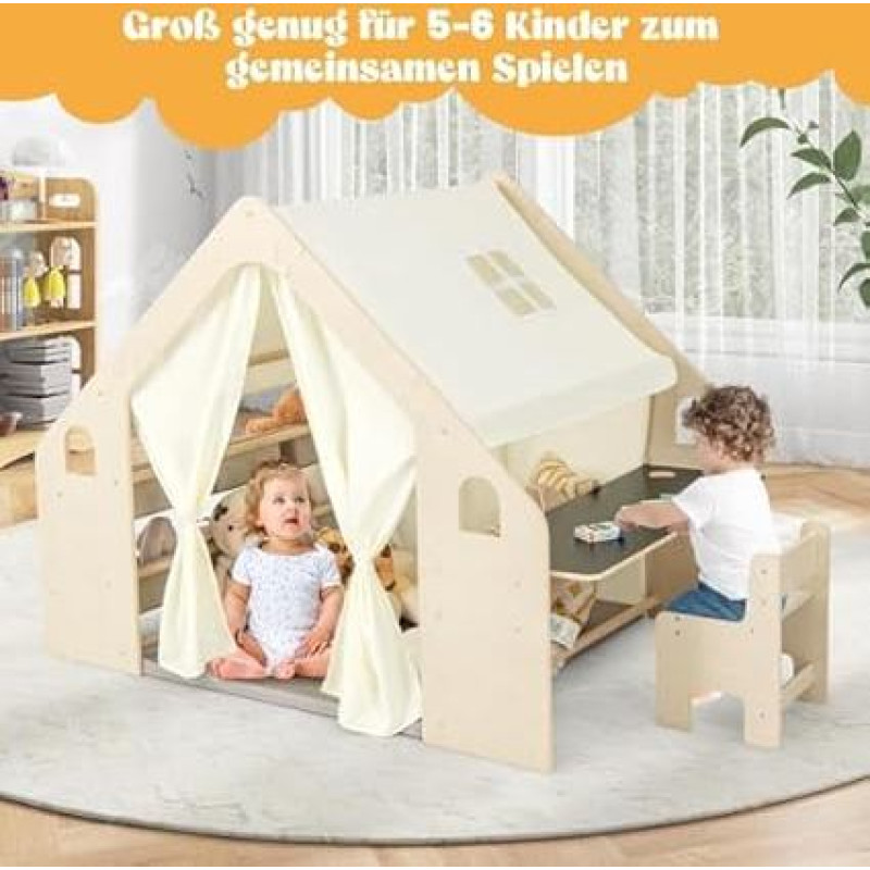 DREAMADE Vaikų vidaus palapinė su kilimėliu, vaikiškų stalų ir kėdžių rinkiniu bei laikymo dėže, žaidimų palapinė, vaikų žaidimų namelis, vidaus medinis žaidimų namelis vaikams nuo 2 metų (didelis su 6 dėžėmis)