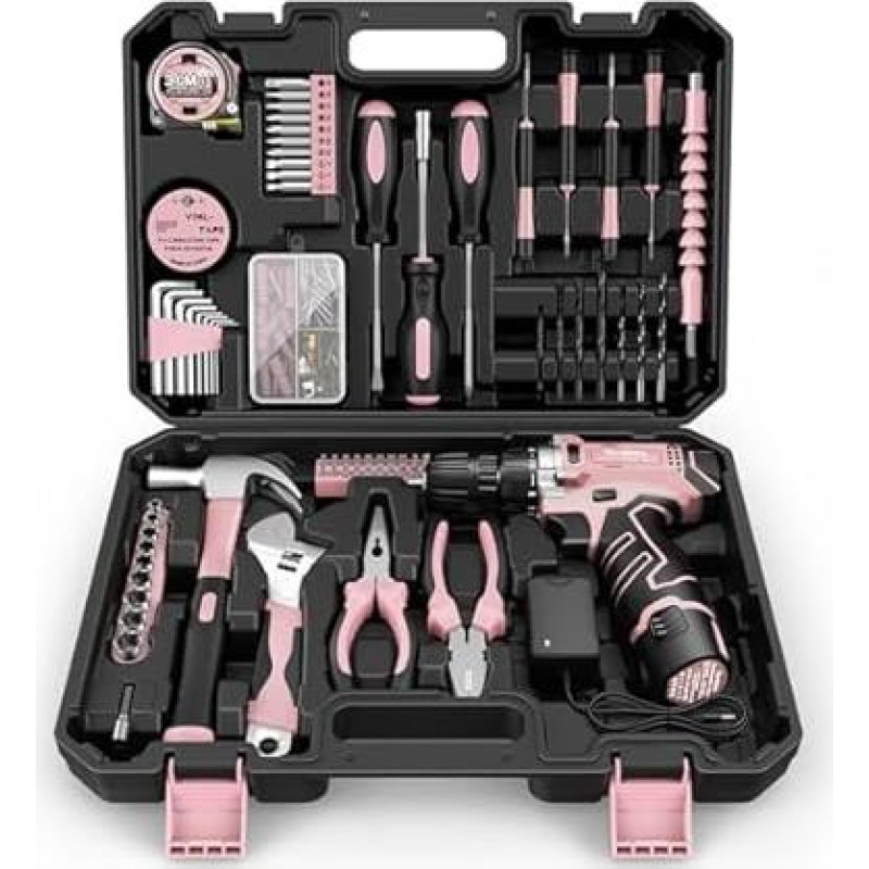 "Sundpey" 12V akumuliatorinių gręžimo įrankių rinkinys Nešiojamasis bendrasis pagrindinių namų automobilių remonto įrankių rinkinys Rausvas įrankių rinkinys moterims su veržliarakčiu, kištukiniu lizdu ir