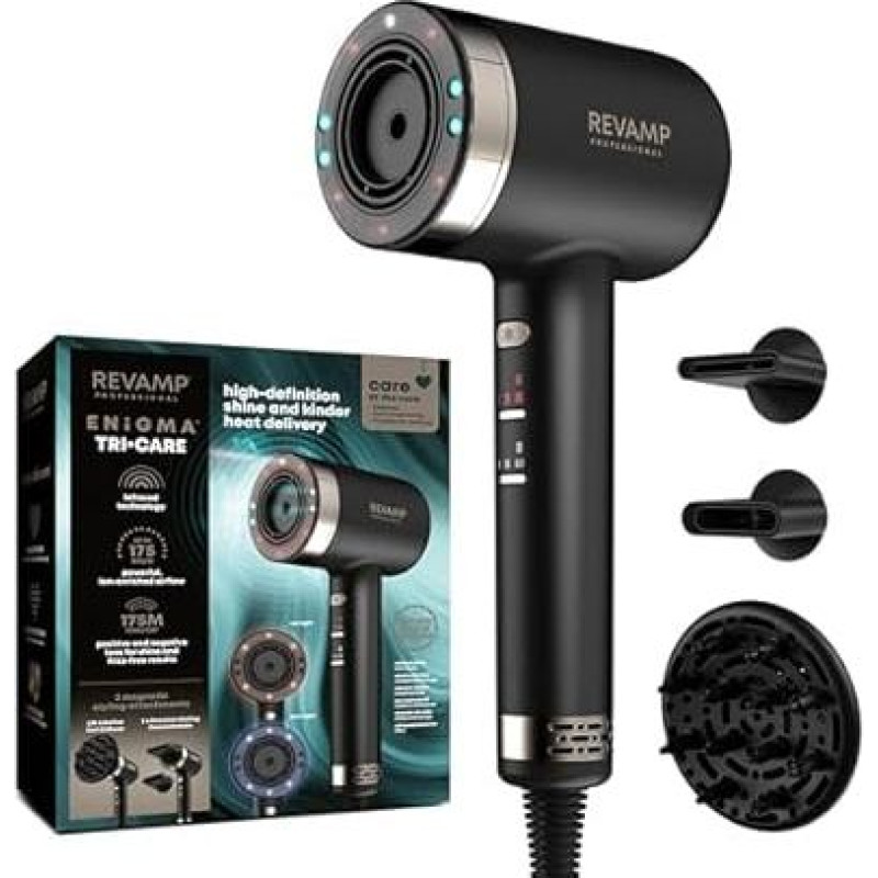"REVAMP Tri-Care" šviesos terapijos plaukų džiovintuvas - jonų ir infraraudonųjų spindulių technologija su "Progloss" aliejais, 3 magnetiniai "Click" priedai, lengvas ir tylus, ypač greitai džiovinantis ir švelniai formuojantis
