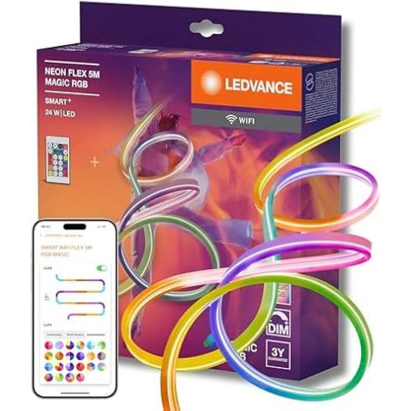 "LEDVANCE SMART WIFI NEON FLEX MGC RGB RC spalvota LED juosta, skirta naudoti lauke, su "WiFi" technologija ir vienodu šviesos pasiskirstymu; reguliuojamas apšvietimas; balta; silikonas; 5 m; lemputė nekeičiama