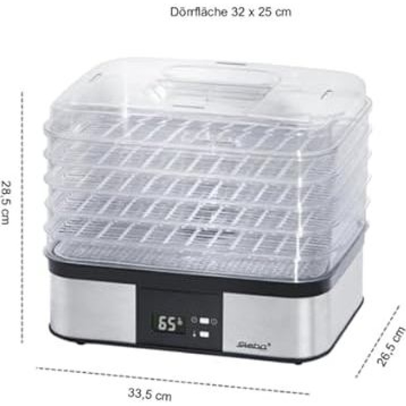 "Steba" elektroninis dehidratorius, 5 skaidrūs priedai be BPA, galima naudoti ir atskirai, 40-70 °C temperatūros reguliavimas, laiko reguliavimas (1-36 val.), 350 W, ED 5