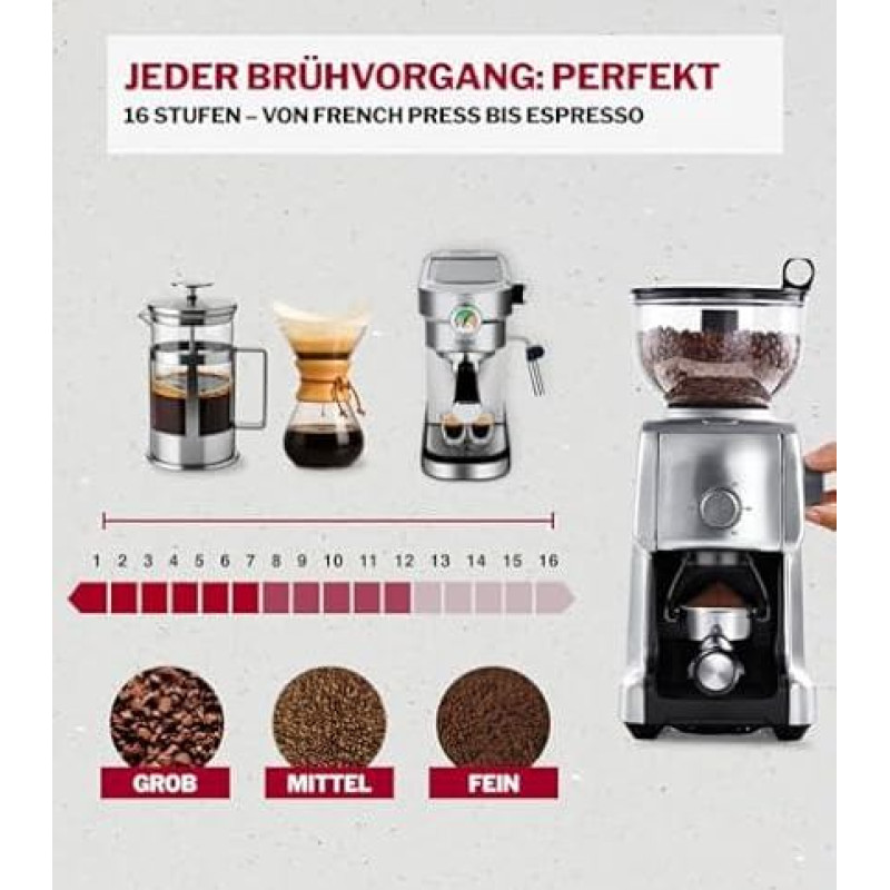 "Turmix" elektrinis kavos malūnėlis TX 190 - kavos malūnėlis su kūginiu malūnėliu, 16 lygių, 400 g pupelių talpa, laikmatis, suderinamas su portafiltru, tiesioginis malimas, 130 W, chromuotas, tylus ir tikslus