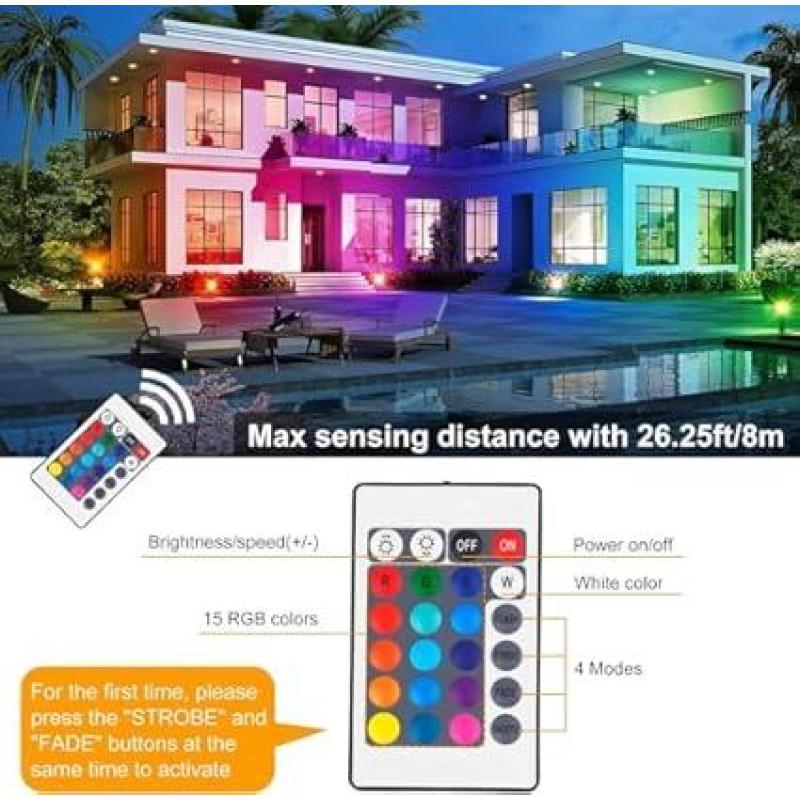100 W LED lauko prožektorius, 4 pakuotės RGB prožektorių su nuotolinio valdymo pulteliu, LED prožektorius, 16 spalvų, 4 režimai, IP66 vandeniui atsparus prožektorius sodams, kiemams