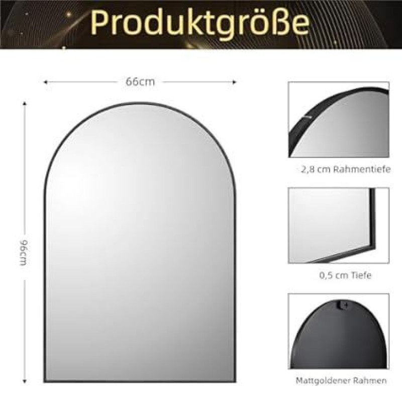 "Clevich" sieninis veidrodis 66 x 96 cm, vonios kambario veidrodis su aliuminio rėmu, arkinis pusapvalis makiažo veidrodis, grūdintas stiklas, skirtas vonios kambariui, prieškambariui, svetainei, miegamajam, juodas