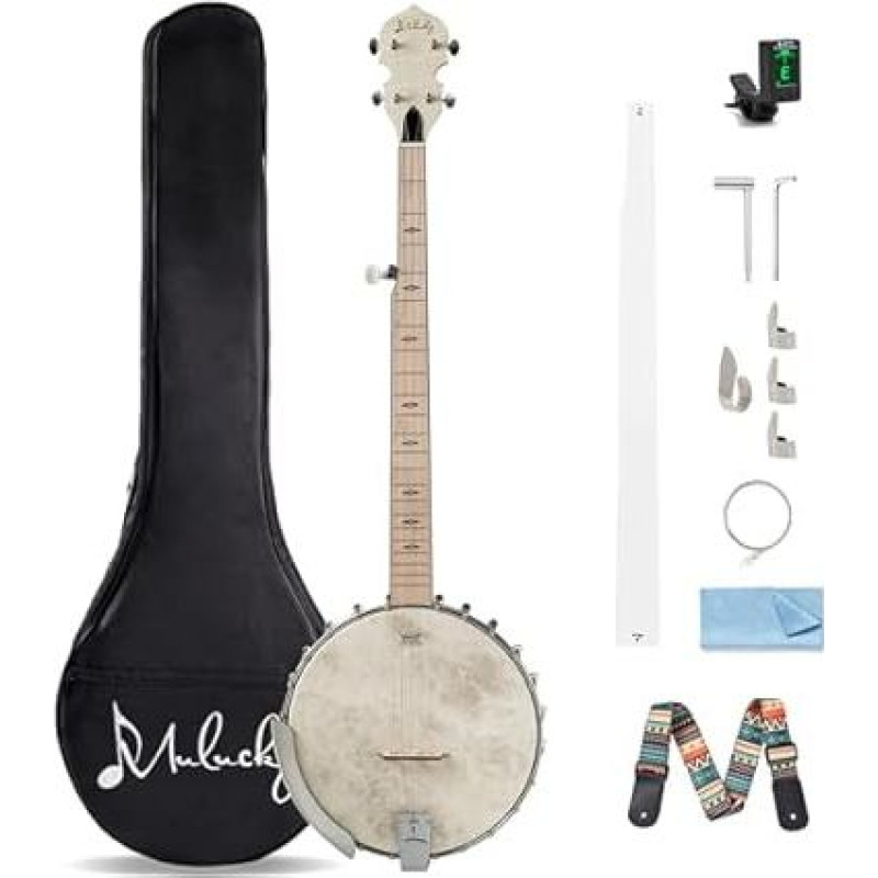 "Mulucky MB1101" 5 stygų banjo pilno dydžio su 24 spaustukais Atviros nugarėlės klevo banjo su "Remo" galvute Penktasis derintuvas su pavarų dėže Dovanų pakuotė su pradedančiojo rinkiniu