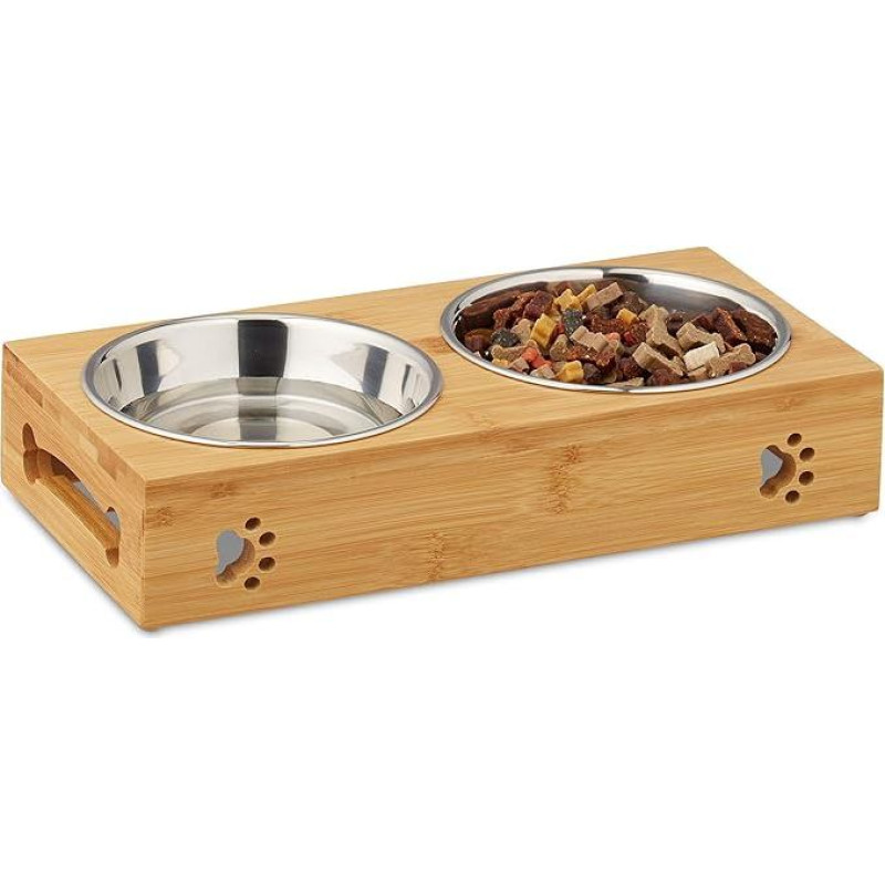 "Relaxdays" šėrimo baras mažiems šunims, 2 dubenėliai po 300 ml, paaukštinti, bambuko ir nerūdijančio plieno, HBT: 6,5 x 31,5 x 15 cm, natūralus / sidabrinis, 1 vnt. 10028859