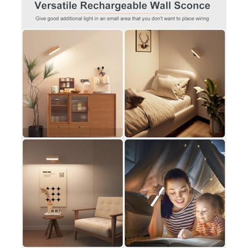 Sieninis šviestuvas be maitinimo jungties, 2 sieninių šviestuvų pakuotė, baterija, LED sieninis šviestuvas, belaidis, reguliuojamas jutiklinis valdymas, 360° pasukamas akumuliatorius, skaitymo lempa, mediena miegamajam, svetainei