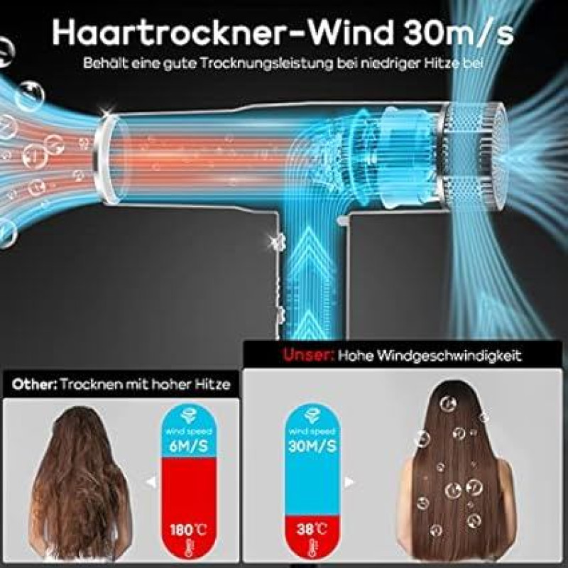 Plaukų džiovintuvas su unikaliu 110 000 aps/min bešepetėliniu varikliu, PARWIN PRO BEAUTY 100 milijonų neigiamų jonų plaukų džiovintuvas, 30 M/S oro srautas greitai džiūsta, naujoviškas mikro filtras (pilkas)