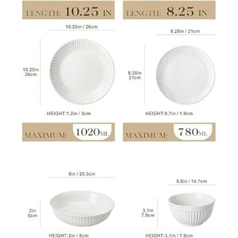 MALACASA LEILA indų rinkinys 6 asmenims, 24 dalių lėkščių rinkinys 6 asmenims, porcelianinių indų rinkinys su rankų darbo reljefiniu dizainu, tinkamas naudoti mikrobangų krosnelėje ir indaplovėje, dubenų ir lėkščių rinkinys, baltas