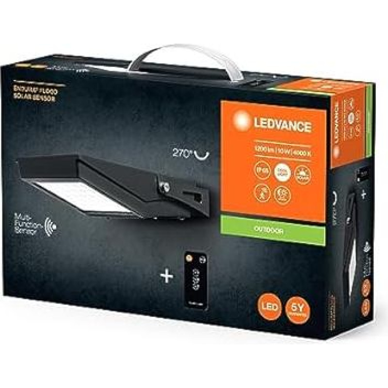 "Ledvance Endura LED Flood Light Solar" 10 W saulės energija Įmontuotas jutiklis Šalta balta šviesa Nuotolinis valdymas Ilgas akumuliatoriaus veikimo laikas Iki 4 val., kai šviesu iki galo Apsaugos klasė IP65