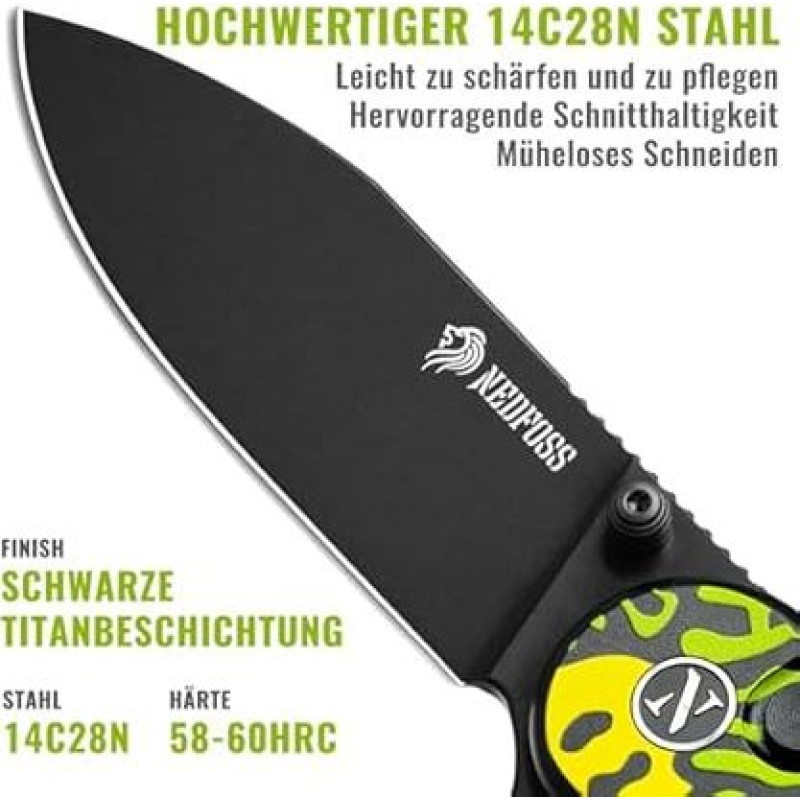 NedFoss Energy sulankstomas peilis, 7,5 cm 14C28N plieninis kišeninis peilis su mygtukiniu užraktu, peilis viena ranka su aliuminine rankena, lauko peilis su diržo spaustuku, išgyvenimo peilis